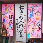 毎年四月に一心寺で開催される人形芝居フェスティバルにて、タイトル垂れ幕の横に5mの絵二枚を描かせていただいております。数年に一度の描き替えで現在は三代目の絵になります。