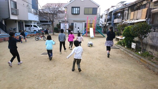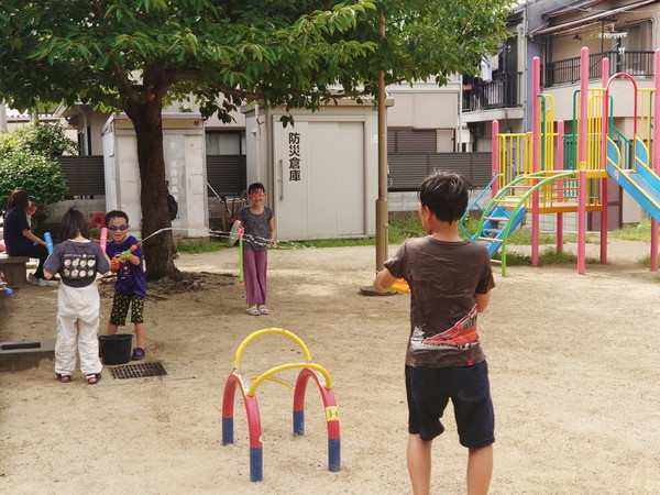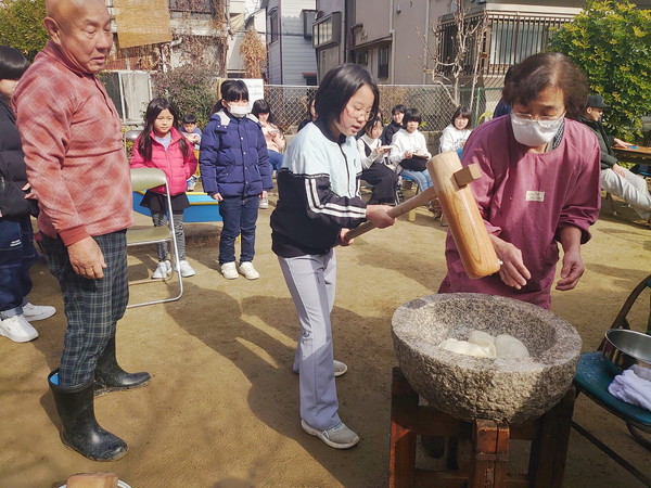 日曜日はお昼休み時間がありまして、お弁当を持ってきた子がいた時は公園で食べたり、鬼ごっこをしたり、夏は水遊びをしたり、地域の餅つきに参加させていただいたりしております。