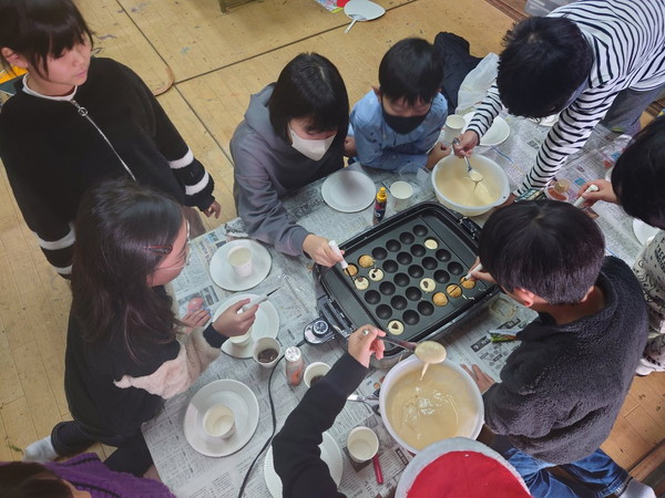 クリスマス会で、この日はたこ焼きホットケーキ作りやプレゼント交換などを行っています。