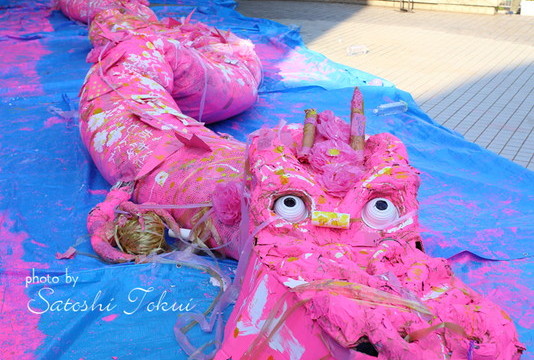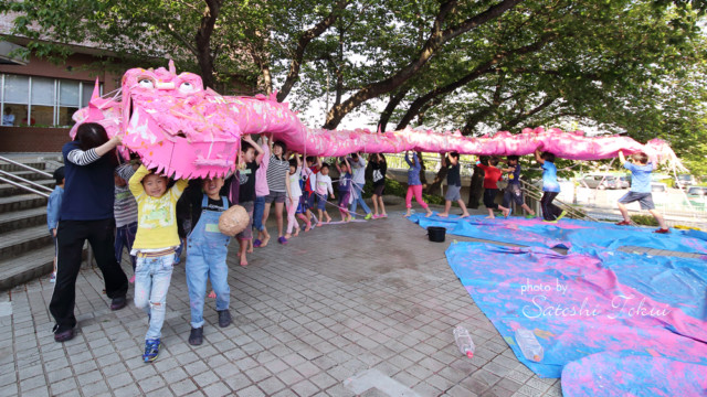 大阪狭山市にある日本最古の人口ため池「狭山池」。その池築造1400年を記念して、桜のスポットとして人気のある狭山池と、その主である龍をテーマに「大きさ桜の龍をつくろう!」と題して、長さ約13mの龍を作りました。龍はしばらくの間、狭山市立公民館に展示されました。