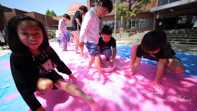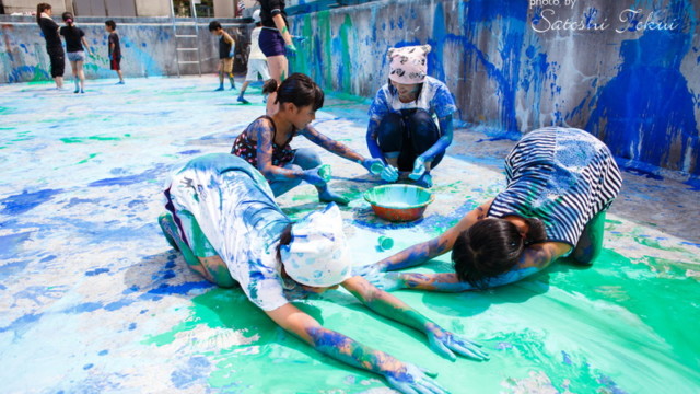 富田林市立中央公民館「アートおどろく公民館」として実施。取り壊されるプールを使って何かできないかという提案で、アートなプール開きを実施。子どもたち約60人が集まり、大勢の子供たちが楽しい思い出を作ったプールを最後に子どもたちの手で感謝の気持ちをこめてアートしました。大きなプールに絵を描くという滅多にできない経験をしました。大阪で空いているプールがあればご連絡ください。