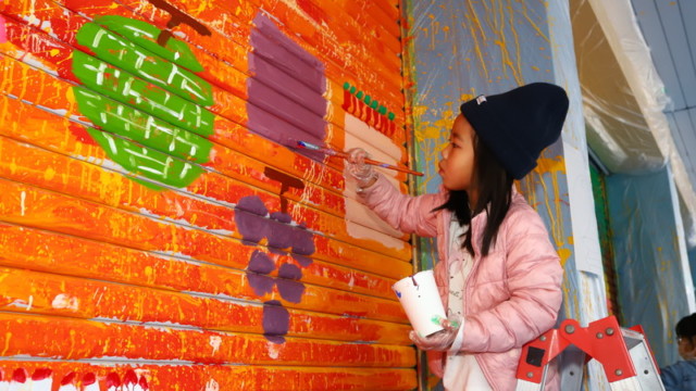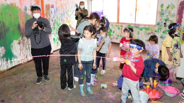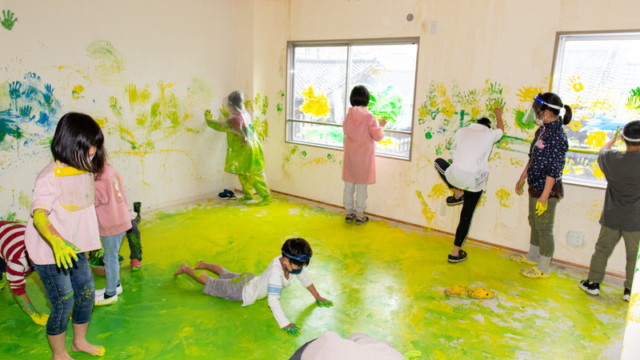 いたや木材さんのビル建て替えに合わせて、子どもたちとビルいっぱいに自由に絵を描く「いたやアートビル」を実施しました。いたやさんにとっても思い出のビル。その歴史を少しお話したあと、みんなに楽しんでもらうことでビルへの感謝の気持ちにしたいことを伝え、子どもたちと思いっきり絵具だらけになりました。