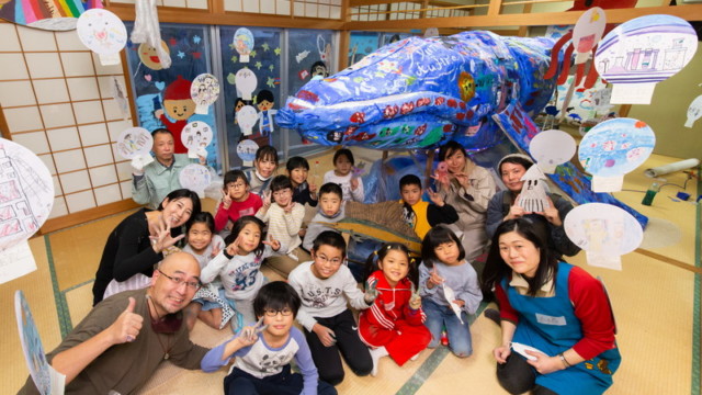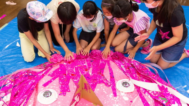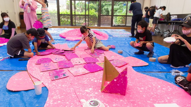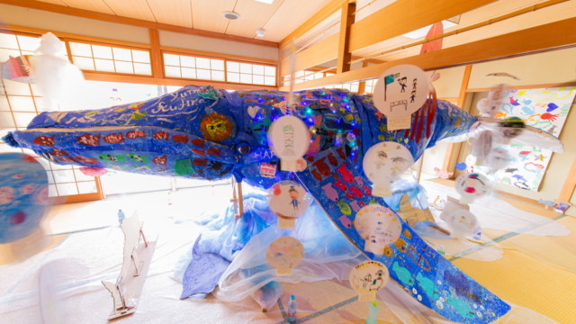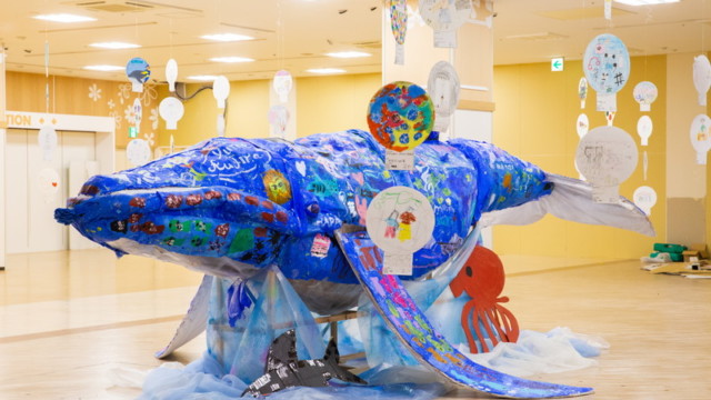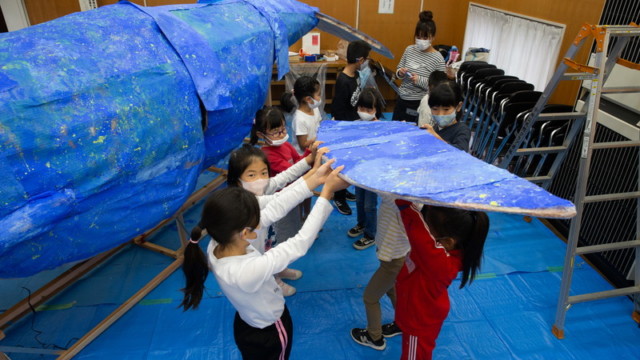 富田林市立中央公民館「アートおどろく公民館」として実施。コロナ禍で萎んでしまった子どもたちの夢や力を大きく膨らまそうと、大勢の子供たちが描いた「夢」の中を泳ぐ大きな「夢くじら」を子どもたちと制作しました。全3回に分けての制作。みんな制作を通じて家族のようにあたたかな雰囲気で制作ができました。出来上がった夢くじらは公民館和室、エコールロゼ、エコール和泉で展示されました。