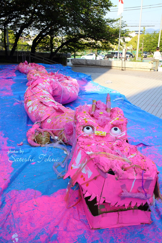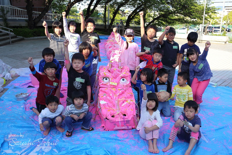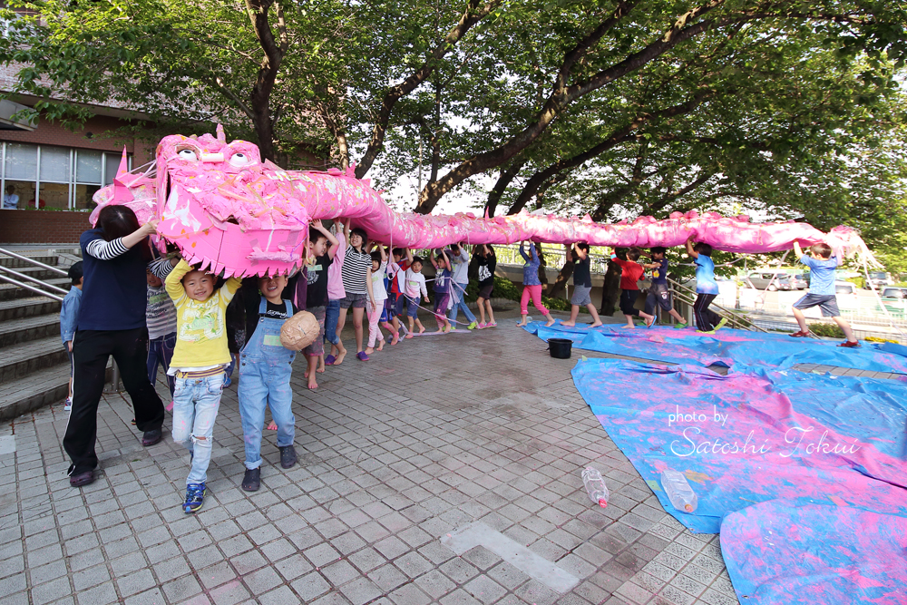 大阪狭山市にある日本最古の人口ため池「狭山池」。その池築造1400年を記念して、桜のスポットとして人気のある狭山池と、その主である龍をテーマに「大きさ桜の龍をつくろう!」と題して、長さ約13mの龍を作りました。龍はしばらくの間、狭山市立公民館に展示されました。