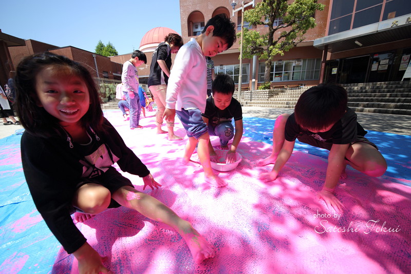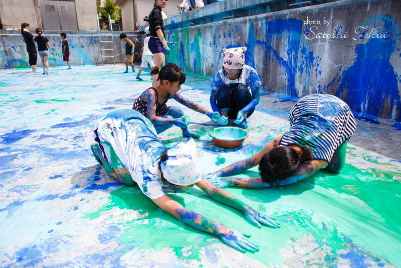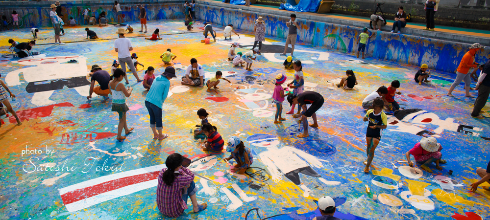 富田林市立中央公民館「アートおどろく公民館」として実施。取り壊されるプールを使って何かできないかという提案で、アートなプール開きを実施。子どもたち約60人が集まり、大勢の子供たちが楽しい思い出を作ったプールを最後に子どもたちの手で感謝の気持ちをこめてアートしました。大きなプールに絵を描くという滅多にできない経験をしました。大阪で空いているプールがあればご連絡ください。