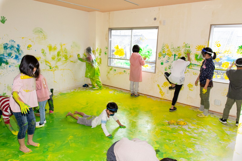 いたや木材さんのビル建て替えに合わせて、子どもたちとビルいっぱいに自由に絵を描く「いたやアートビル」を実施しました。いたやさんにとっても思い出のビル。その歴史を少しお話したあと、みんなに楽しんでもらうことでビルへの感謝の気持ちにしたいことを伝え、子どもたちと思いっきり絵具だらけになりました。