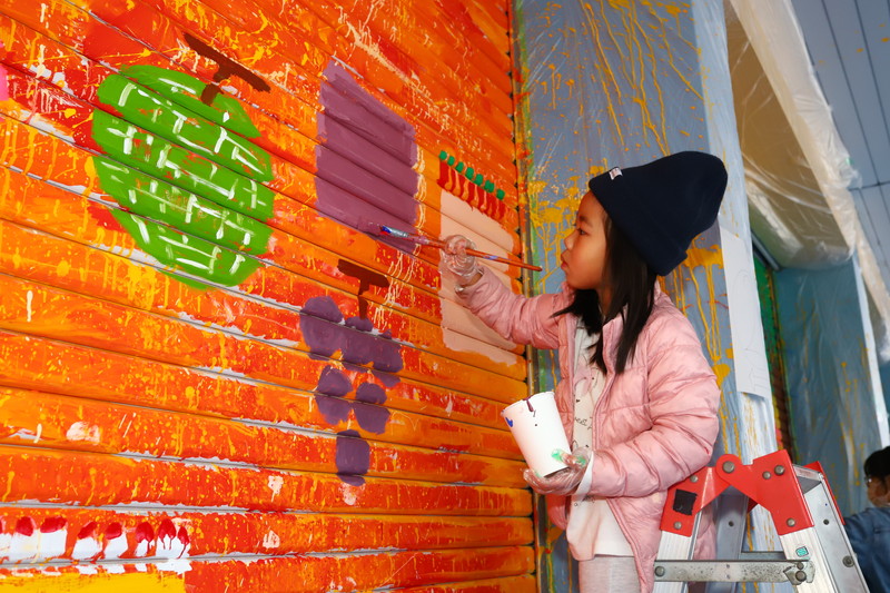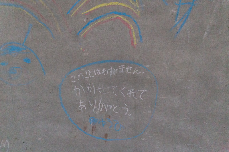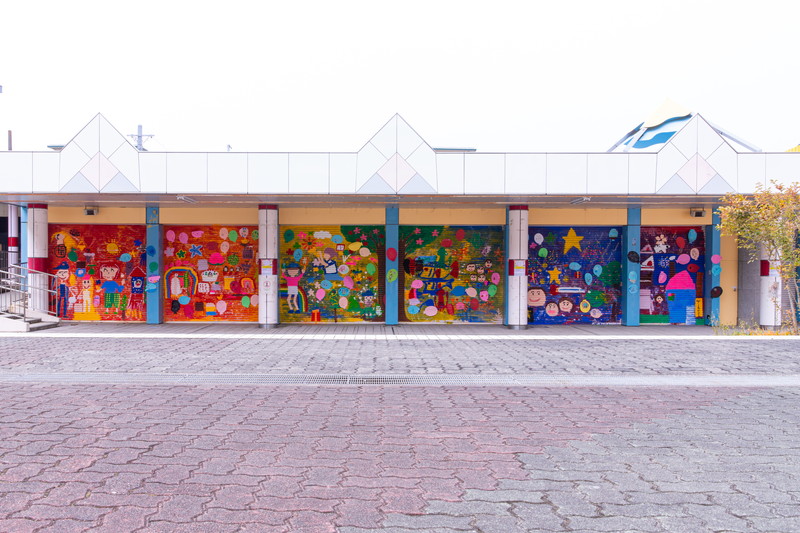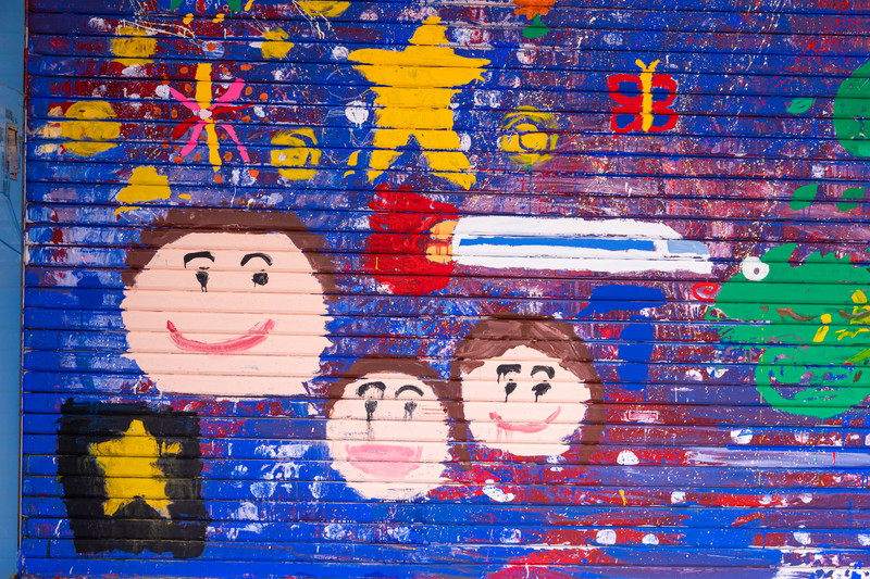 富田林市金剛銀座商店街で取り壊しになるピュア金剛のシャッターに子どもたちと自由に絵を描きました。イベントでも観る人を楽しませてくれて、子どものアートが町を行く人たちをしばらくの間元気にしてくれました。