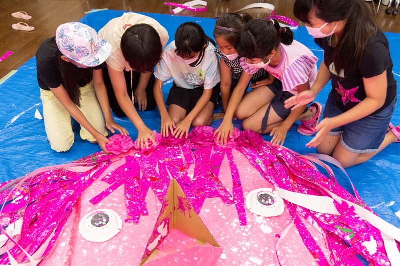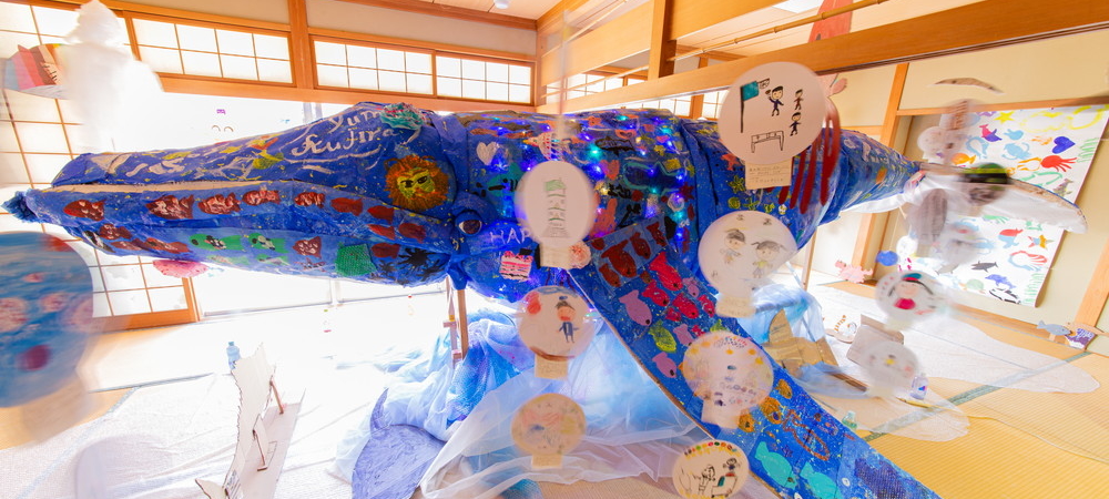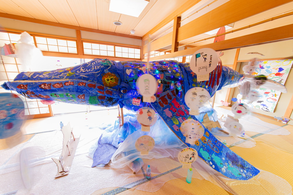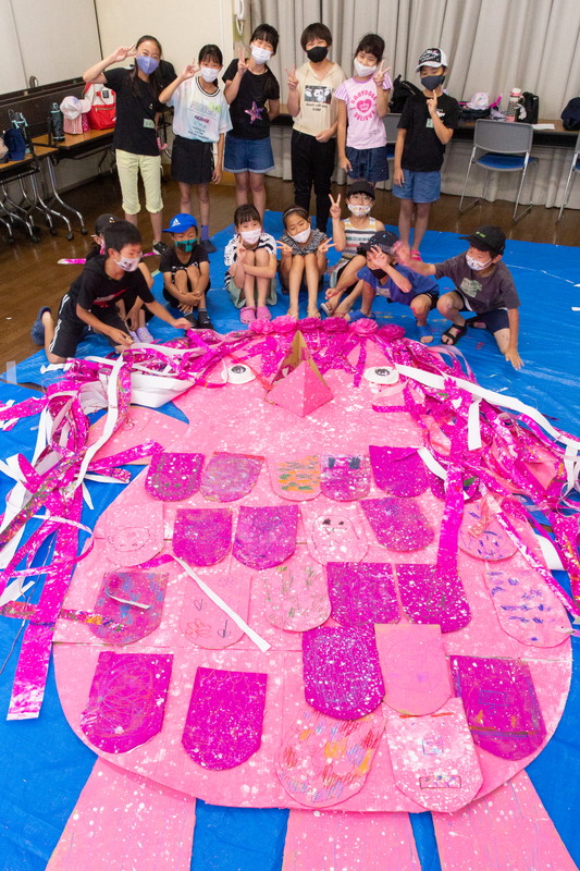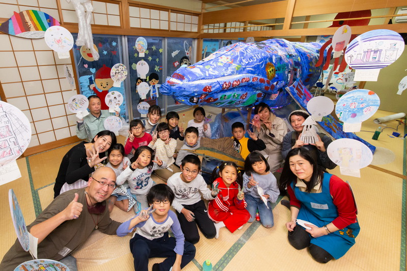 富田林市立中央公民館「アートおどろく公民館」として実施。コロナ禍で萎んでしまった子どもたちの夢や力を大きく膨らまそうと、大勢の子供たちが描いた「夢」の中を泳ぐ大きな「夢くじら」を子どもたちと制作しました。全3回に分けての制作。みんな制作を通じて家族のようにあたたかな雰囲気で制作ができました。出来上がった夢くじらは公民館和室、エコールロゼ、エコール和泉で展示されました。